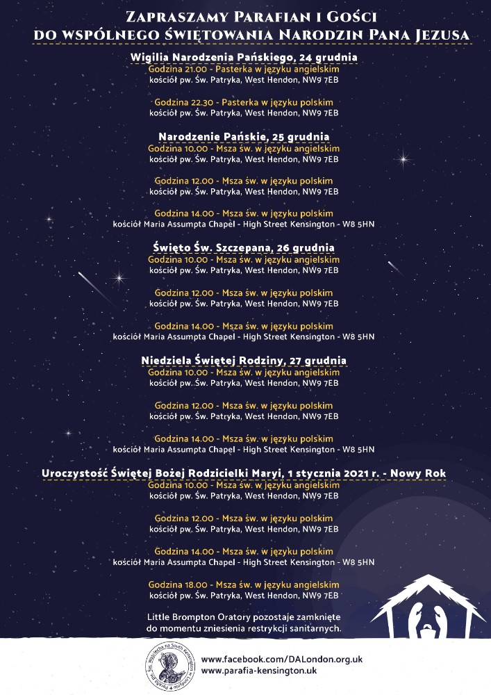 Godzina 21.00 - Pasterka w języku angielskim - kościół pw. Św. Patryka, West Hendon, NW9 7EB.