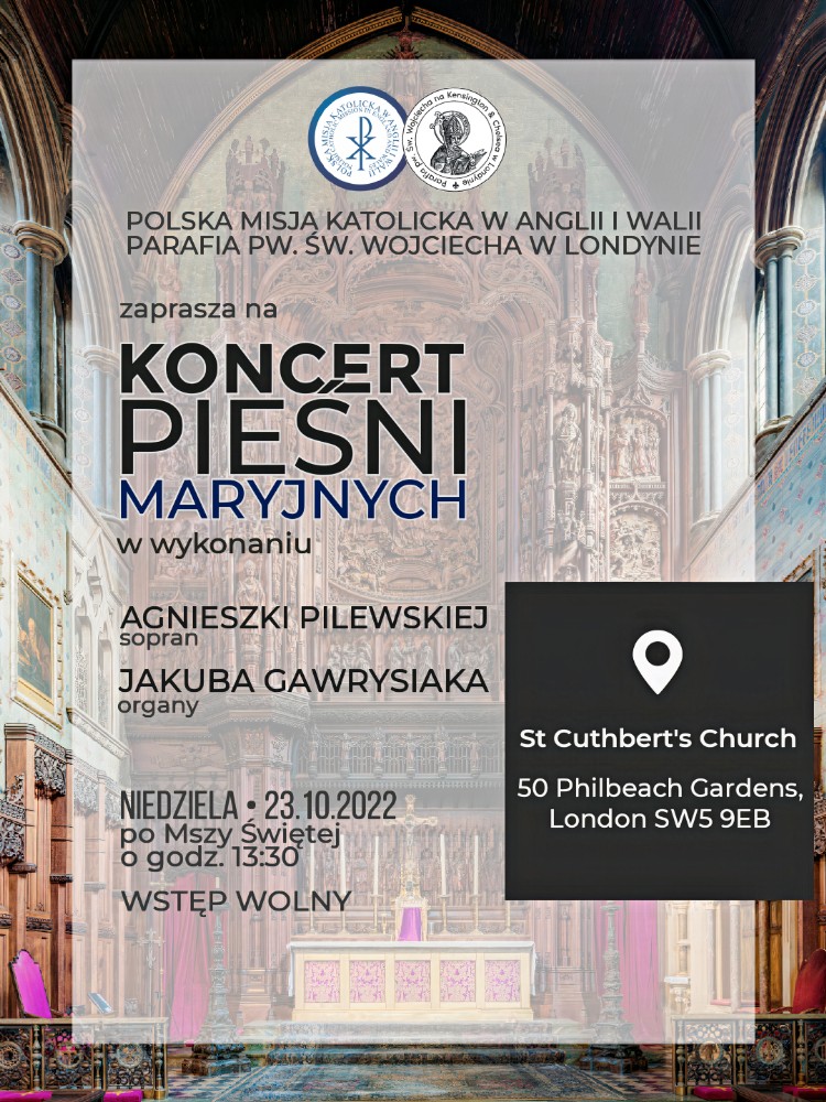 KONCERT PIEŚNI MARYJNYCH: w wykonaniu Agnieszki Pilewskiej (sopran) i Jakuba Gawrysiaka (organy) – niedziela, 23 października w kościele parafialnym po Mszy św. o godz. 13.30.