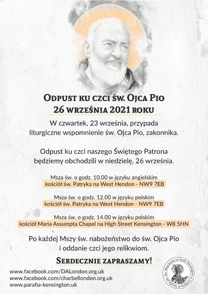 - Msza św. o godz. 14.00 w języku polskim - kościół Maria Assumpta Chapel na High Street Kensington - W8 5HN.