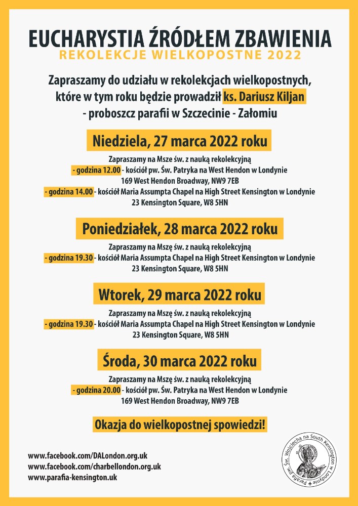 - godzina 19.30 - kościół Maria Assumpta Chapel na High Street Kensington w Londynie - 23 Kensington Square, W8 5HN.