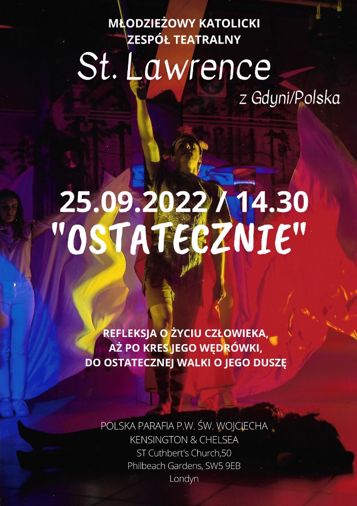 Młodzi artyści zaprezentują widowisko muzyczne pt. „Ostatecznie”. W czasie niezwykle interesującego spektaklu będziemy śledzić losy głównego bohatera od jego narodzin, przez dorastanie, aż do momentu śmierci, kiedy to zobaczymy konsekwencje jego wyborów. Zobaczymy również, jak przy końcu jego życia sam św. Michał Archanioł staje do ostatecznej walki o ludzką duszę. Spektakl był dotychczas wystawiany w Polsce, Wielkiej Brytanii i Hongkongu.