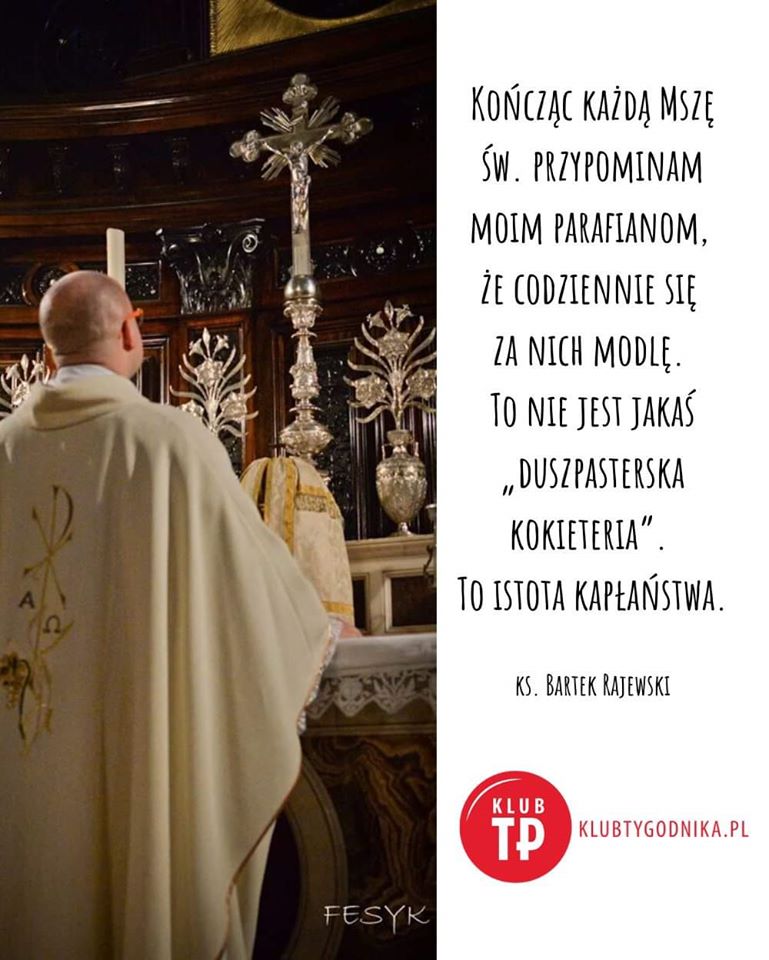 Wybaczcie osobiste wspomnienia. W czasie pierwszej sprawowanej przeze mnie Eucharystii (tzw. mszy prymicyjnej), homilię wygłosił ks. abp Henryk Muszyński. Przywołał wówczas historię ze swojej młodości. "Za młodych lat - mówił - w czterech kapłanów wędrowaliśmy po Francji. Byliśmy m.in. w katolickiej Bretanii. Wczesnym rankiem usłyszałem sygnaturkę. Nie wiedziałem czy jest w tej miejscowości kościół, gdzie jest kościół, jaki to kościół. Odszukałem i poszedłem do tego kościoła i tam zastałem kapłana zupełnie samego, który stał przy ołtarzu i się modlił. Kiedy podszedłem do niego i zapytałem: „Proszę księdza, to ksiądz tak całe życie sam zupełnie się modli?”, odpowiedział: „Nie, w niedzielę mam paru wiernych, ale co dzień to się modlę sam. To ty jesteś księdzem i tego nie rozumiesz, że naszym powołaniem jest modlitwa? Moi ludzie pracują, oni nie mają czasu na modlitwę. Kto się ma za nich modlić? To jest nasze powołanie!”.